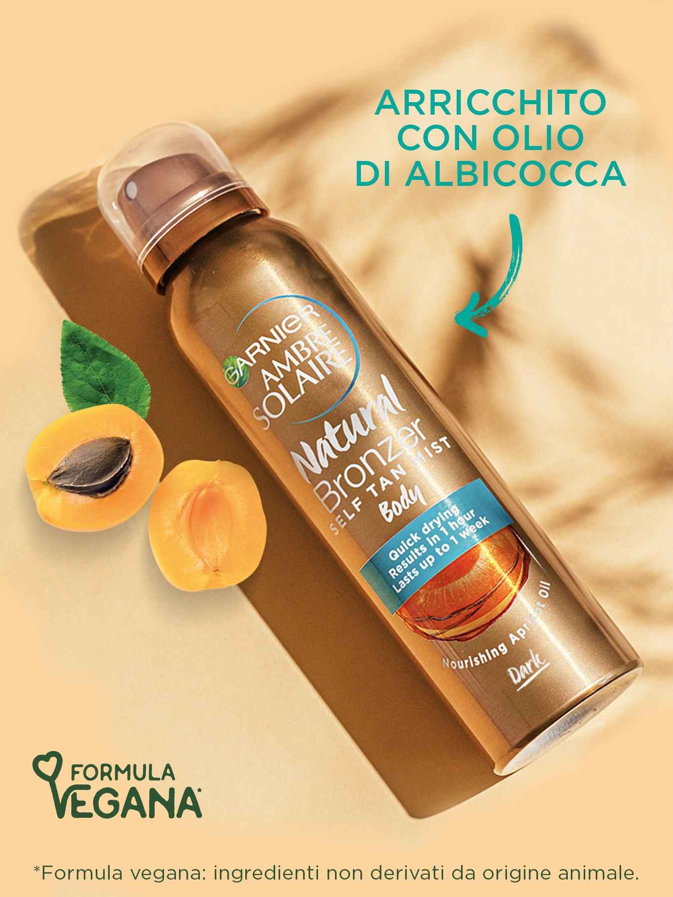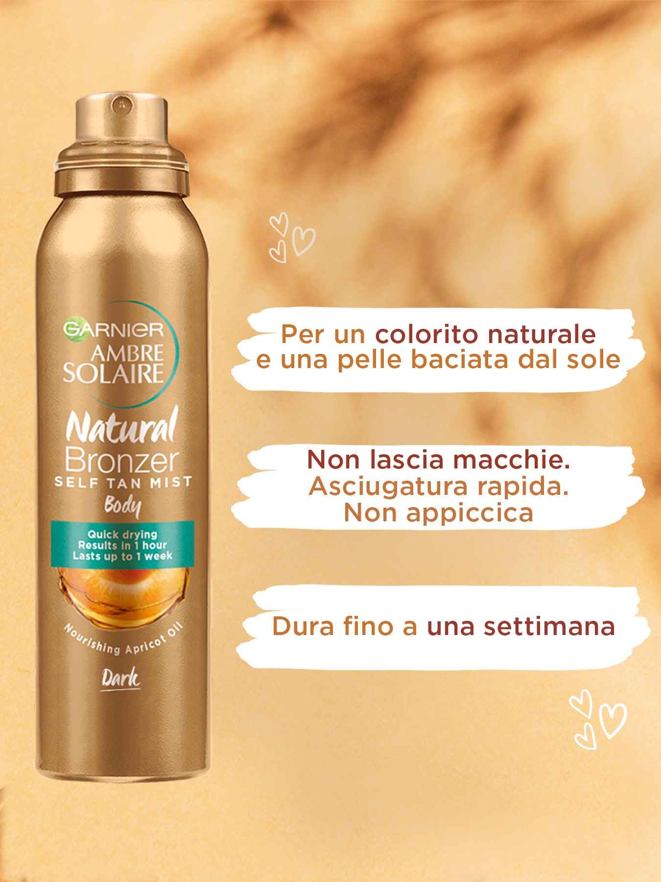 Spray autoabbronzante per il corpo per un effetto abbronzatura naturale e radioso e una pelle baciata dal sole tutto l'anno, Shade Media, Asciugatura rapida - Risultati: Abbronzatura dorata in solo un'ora, Dura fino a una settimana*, Non lascia macchie sulla pelle - Consigli per l'uso: Agitare e vaporizzare in modo uniforme sulla pelle asciutta a circa 30 cm di distanza, Massaggiare delicatamente fino al completo assorbimento, quindi risciacquare bene le mani, Attendere un'ora per vedere il risultato*, Per un colorito più duraturo, esfoliare la pelle con uno scrub prima dell'applicazione - Texture ultra-leggera arricchita con Vitamina E pura e olio d'albicocca nutriente e un profumo piacevole - Contenuto: 1x Spray autoabbronzante per il corpo Garnier Ambre Solaire Natural Bronzer, 150 ml *Test Strumentale - 21 soggetti, dopo una applicazione.