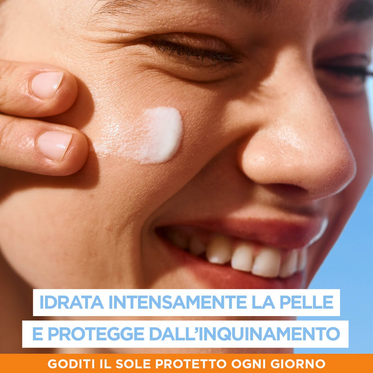 Protezione molto alta SPF50+ contro UVB, UVA e UVA lunghi, arricchita con Acido Ialuronico per idratare quotidianamente e proteggere dall'inquinamento.