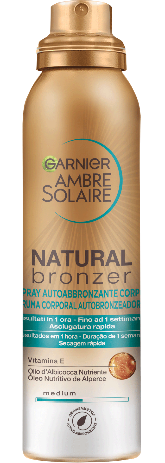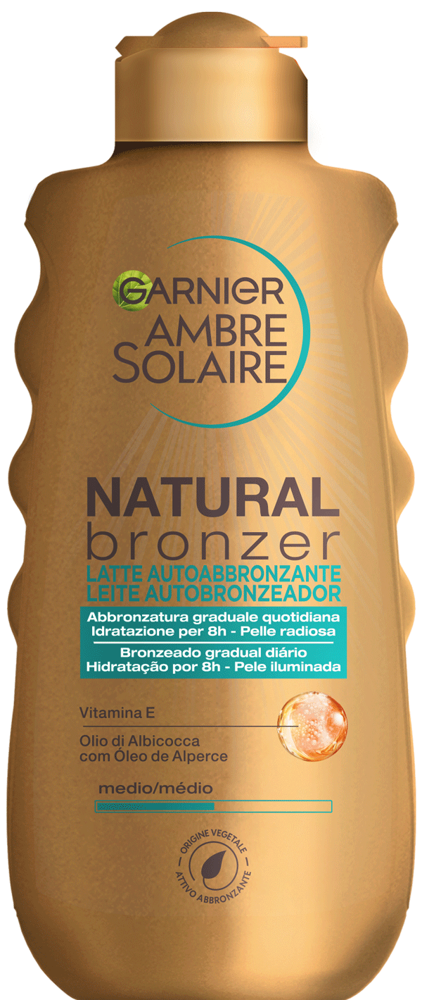 La linea Natural Bronzer di Garnier offre soluzioni per un’abbronzatura rapida, arricchite con attivi 100% vegetali e olio d’albicocca nutriente, per un colorito radioso naturale. Il risultato? La pelle appare dorata, idratata e levigata.