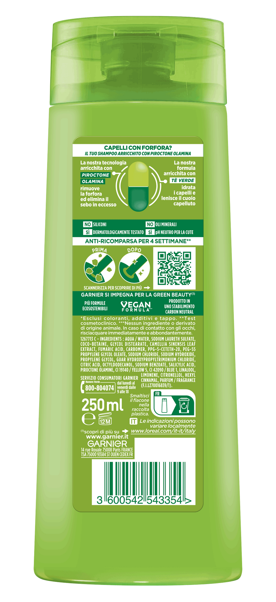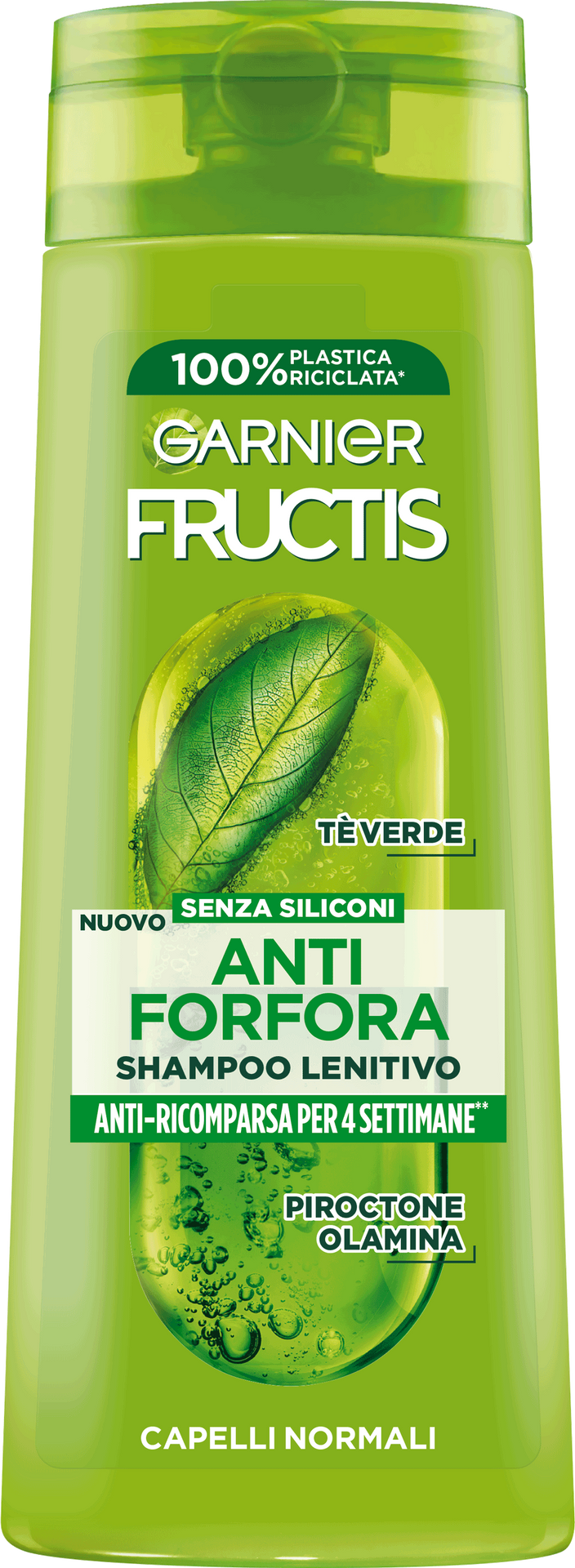 Shampoo Fructis Antiforfora lenitivo per capelli normali. La nostra formula arricchita con tè verde idrata i capelli e lenisce il cuoio capelluto, In più, la nostra tecnologia arricchita con piroctone olamina rimuove la forfora ed elimina il sebo in eccesso.