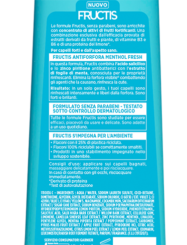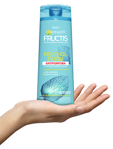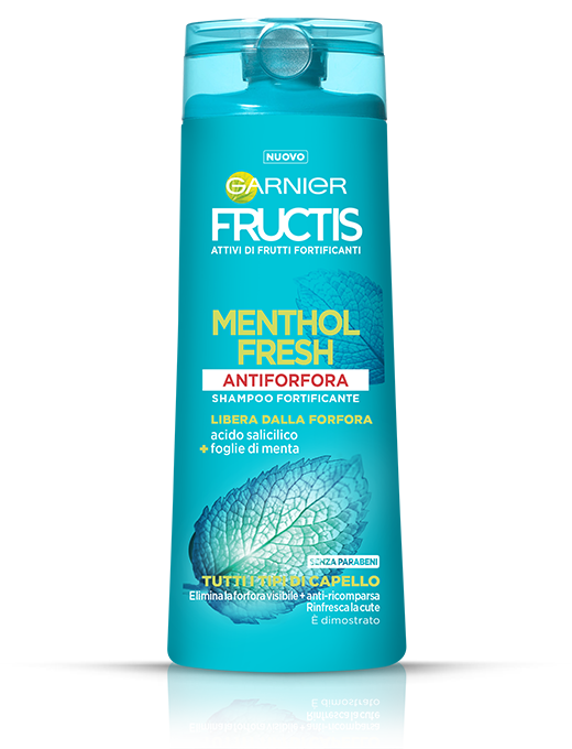 Dedicato a tutti i tipi di capelli, lo shampoo antiforfora Fructis Antiforfora Menthol Fresh combina l’acido salicilico e lo zinco piritione antibatterici con l’estratto di foglie di menta, conosciuta per le proprietà rinfrescanti. Elimina la forfora visibile* combattendo gli agenti che la causano, rinfresca la cute.