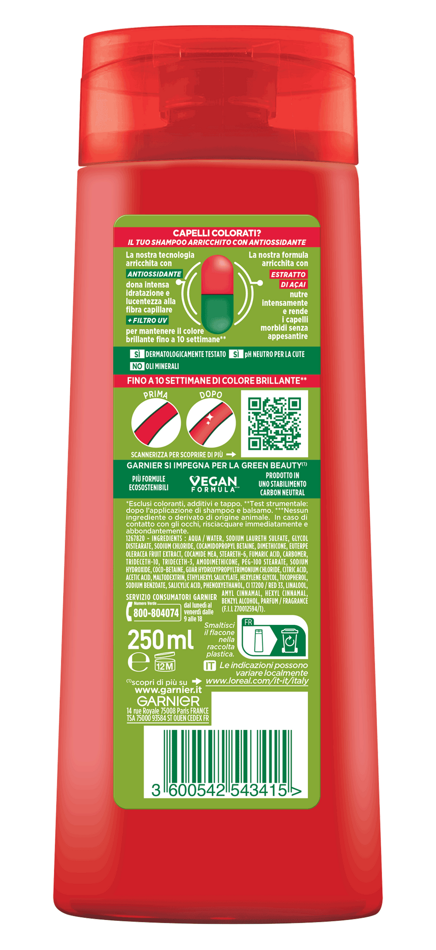 Fructis Color Resist Shampoo ravvivante, per capelli colorati. La nostra formula arricchita con estratto di acai nutre intensamente e rende i capelli morbidi senza appesantire. Inoltre, la nostra tecnologia arricchita con antiossidante dona intensa idratazione e lucentezza della fibra capillare, il filtro UV mantiene il colore brillante per 10 settimane.* *test strumentale dopo l'applicazione di shampoo e balsamo