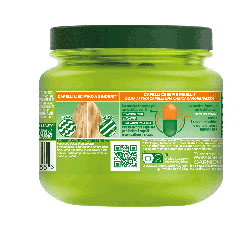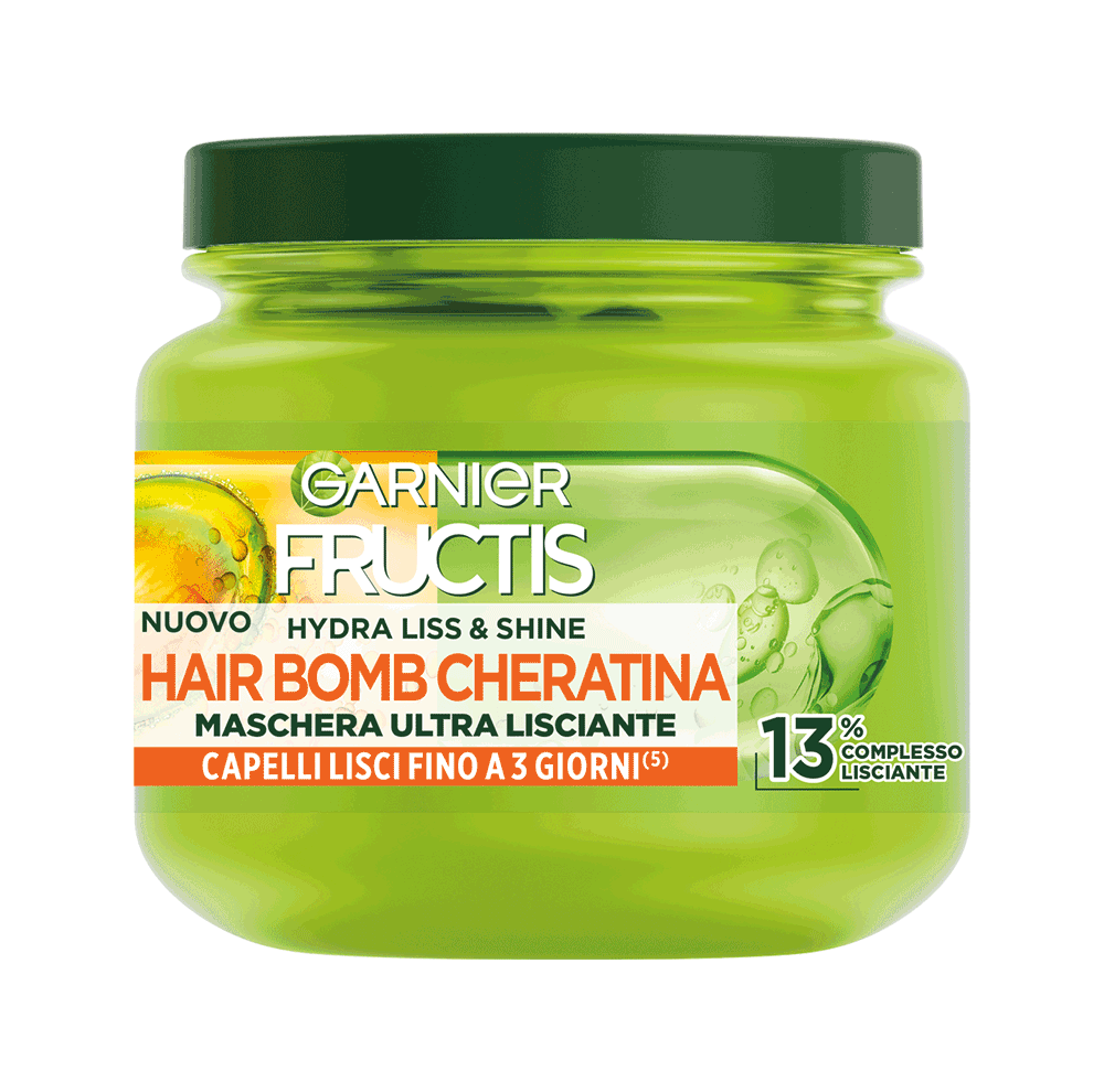 La maschera Fructis Hair Bomb Hydra Liss and Shine con Cheratina è ideale per capelli crespi e ribelli, rendendoli ultra lisci. La nostra formula arricchita con Olio d'argan rende i capelli morbidi e dona intensa luminosità.