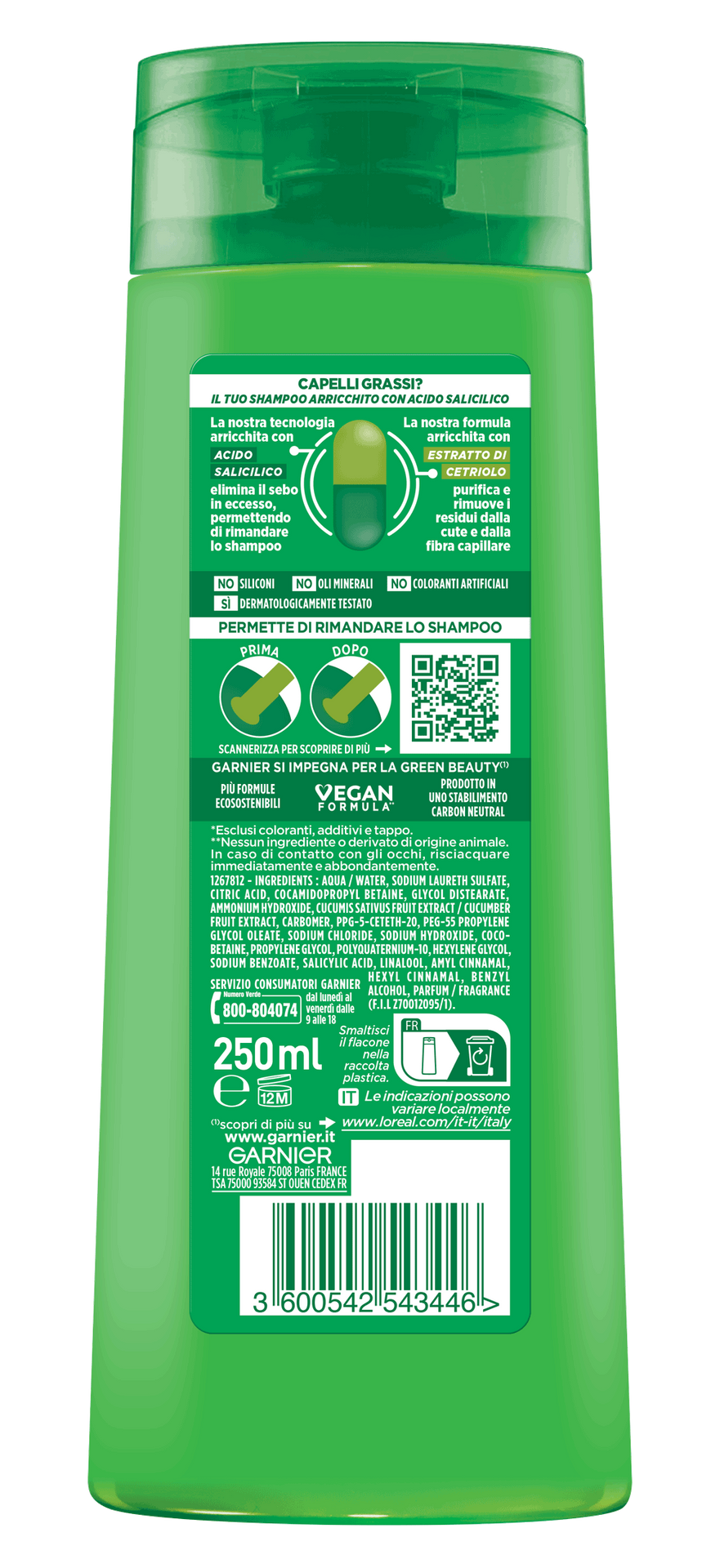 Fructis Shampoo Cucumber Fresh, shampoo purificante per capelli grassi. La nostra formula arricchita con estratto di cetriolo purifica e rimuove i residui dalla cute e dalla fibra capillare. La nostra tecnologia arricchita con acido salicilico elimina il sebo in eccesso, permettendo di rimandare lo shampoo.