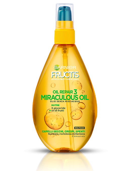 Dedicato ai capelli secchi, crespi e spenti, l'olio senza risciacquo Oil Repair 3 Miraculous Oil combina il 3-glyceride, noto per il suo potere ammorbidente, con gli oli di frutti nutrienti. La sua formula avvolge i capelli e li nutre istantaneamente.