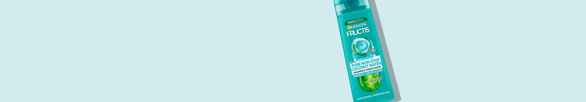 Dedicato ai capelli normali rapidi ad ingrassarsi, lo shampoo fortificante Fructis Pure Non-Stop Coconut Water associa nella sua formula senza siliconi e senza parabeni, l'acqua di cocco e agenti purificanti per fortificare e purificare cute e capelli, donando idratazione alle punte.