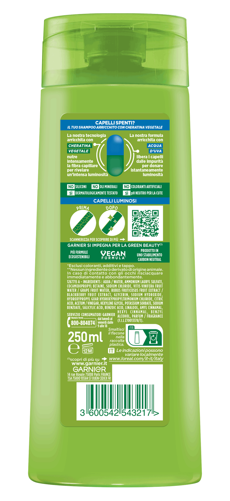Lo Shampoo Puliti & Brillanti è ideale per i capelli spenti, rendendoli più luminosi. La nostra formula, arricchita con acqua d'uva libera i capelli dalle impurità per donare istantaneamente luminosità. La nostra tecnologia arricchita con cheratina vegetale nutre intensamente la fibra capillare per rivelare un'intensa luminosità.