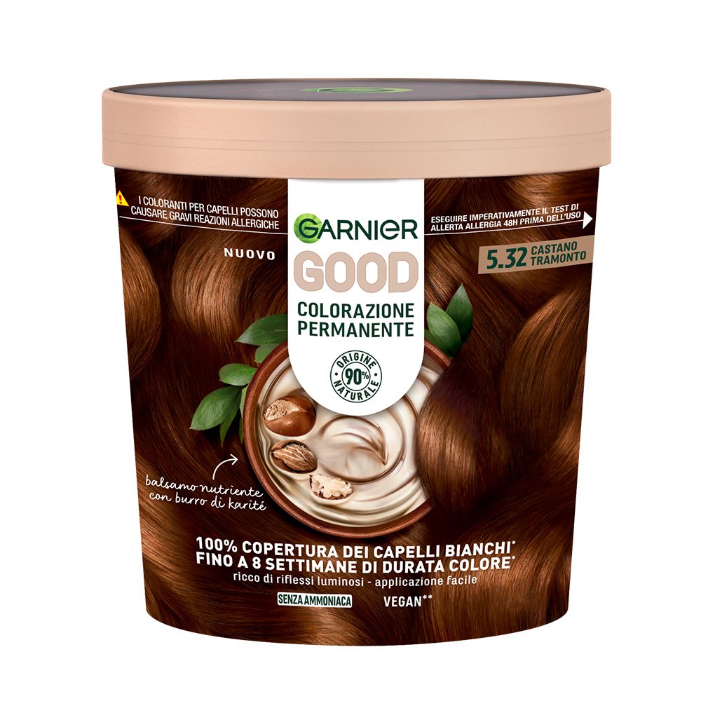 Garnier GOOD, colorazione permanente senza ammoniaca, 90% di origine naturale, copre il 100% dei capelli bianchi*. Texture che non cola, si applica facilmente come una maschera e ha una fragranza delicata. Infonde profondamente i pigmenti e dura fino a 8 settimane* donando un aspetto sano** al capello e uno splendido effetto intensamente luminoso.