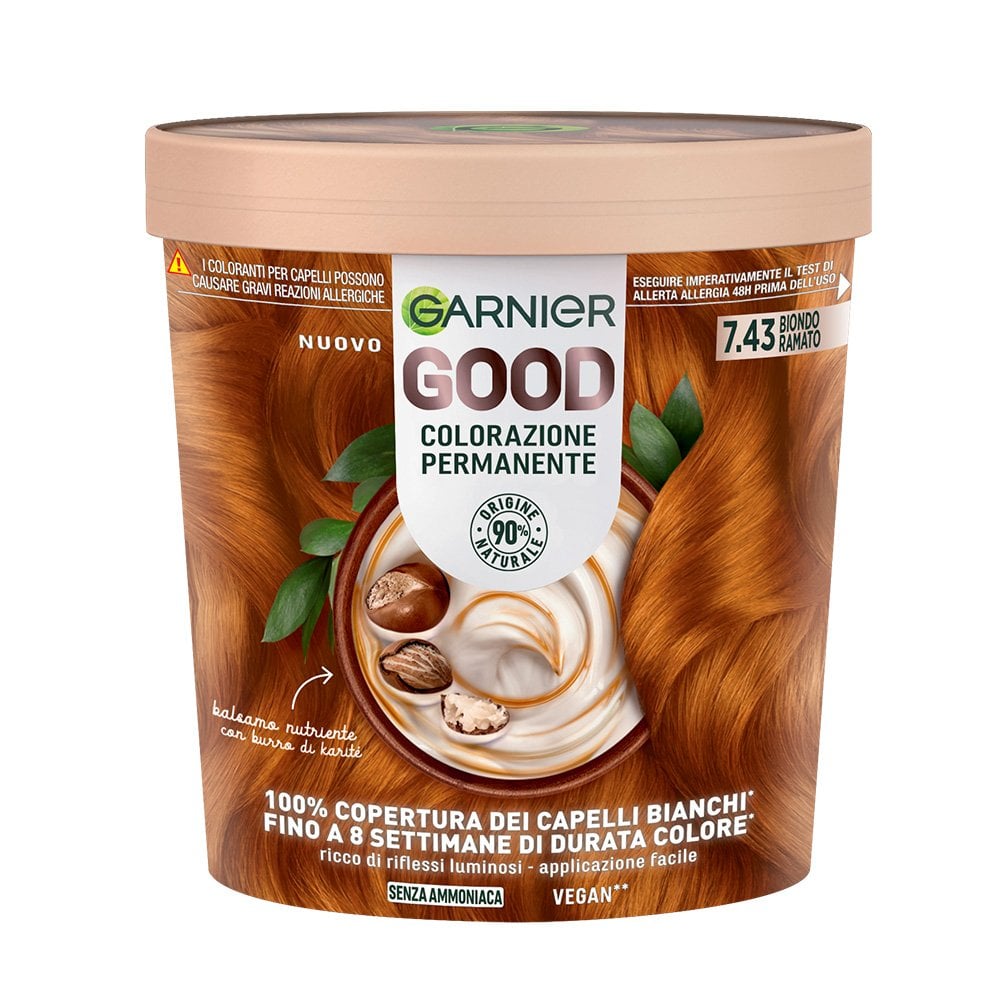 Garnier GOOD, colorazione permanente senza ammoniaca, 90% di origine naturale, copre il 100% dei capelli bianchi*. Texture che non cola, si applica facilmente come una maschera e ha una fragranza delicata. Infonde profondamente i pigmenti e dura fino 8 settimane* donando un aspetto sano** al capello e uno splendido effetto intensamente luminoso.