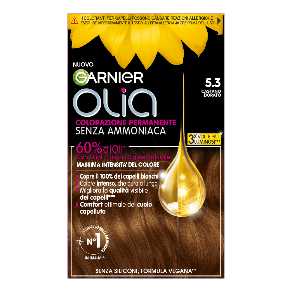 ARRICCHITO CON OLI DI FIORI Olia, la prima colorazione permanente di Garnier attivata dall’olio e senza ammoniaca per una fragranza delicata, rende la colorazione un momento di piacere unico. 60% DI OLI NELLA CREMA COLORANTE Con un'alta concentrazione di oli nella sua formula, Olia offre un’intensità del colore massima, un comfort ottimale del cuoio capelluto, un miglioramento visibile della qualità del capello* unito a una delicata fragranza floreale. * Test strumentali