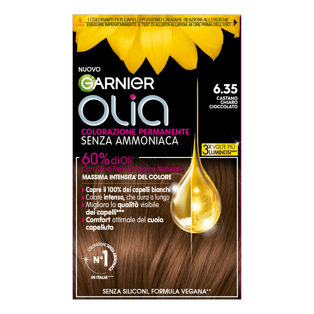 ARRICCHITO CON OLI DI FIORI Olia, la prima colorazione permanente di Garnier attivata dall’olio e senza ammoniaca per una fragranza delicata, rende la colorazione un momento di piacere unico. 60% DI OLI NELLA CREMA COLORANTE Con un'alta concentrazione di oli nella sua formula, Olia offre un’intensità del colore massima, un comfort ottimale del cuoio capelluto, un miglioramento visibile della qualità del capello* unito a una delicata fragranza floreale. * Test strumentali