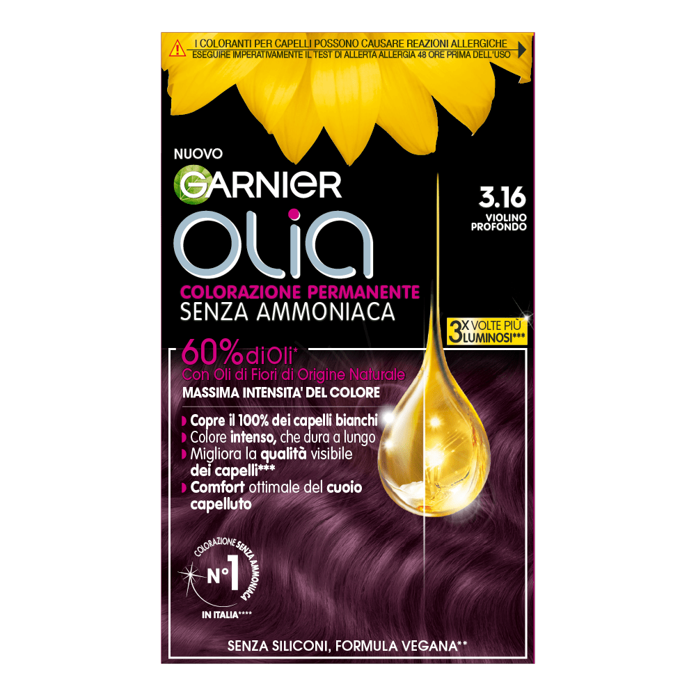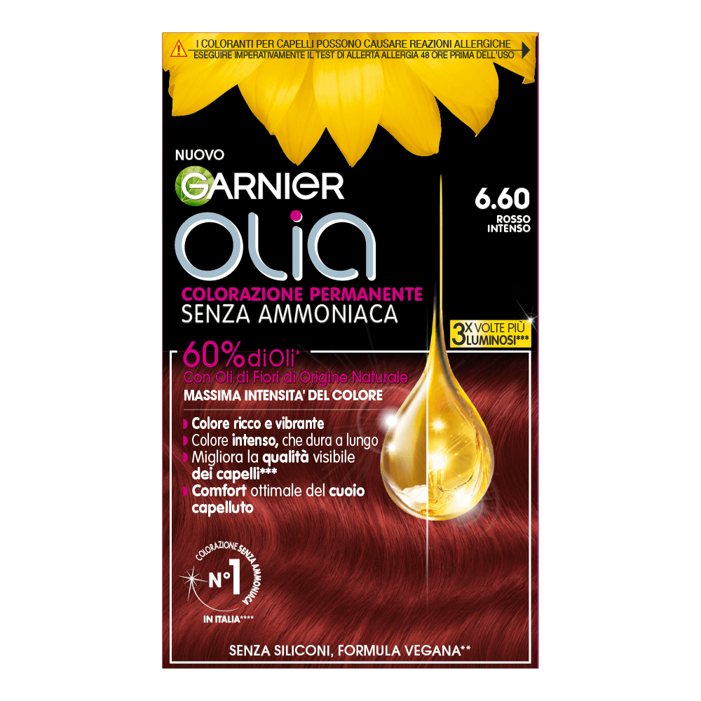 ARRICCHITO CON OLI DI FIORI Olia, la prima colorazione permanente di Garnier attivata dall’olio e senza ammoniaca per una fragranza delicata, rende la colorazione un momento di piacere unico. 60% DI OLI NELLA CREMA COLORANTE Con un'alta concentrazione di oli nella sua formula, Olia offre un’intensità del colore massima, un comfort ottimale del cuoio capelluto, un miglioramento visibile della qualità del capello* unito a una delicata fragranza floreale. * Test strumentali