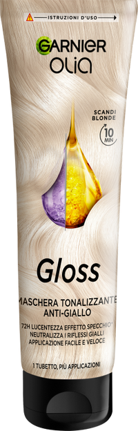 Garnier Olia presenta la nuova linea Olia Gloss, 4 maschere coloranti per capelli naturali, colorati o decolorati. Ravvivano immediatamente il tuo colore per un risultato naturale e capelli extra lucenti. Scandi Blonde è la maschera tonalizzante anti-giallo pensata per capelli decolorati o con schiariture per neutralizzare i riflessi gialli. L'effetto dura fino a 4 lavaggi* e corregge fino a 1 anno di danni** Applicazione facile e veloce.