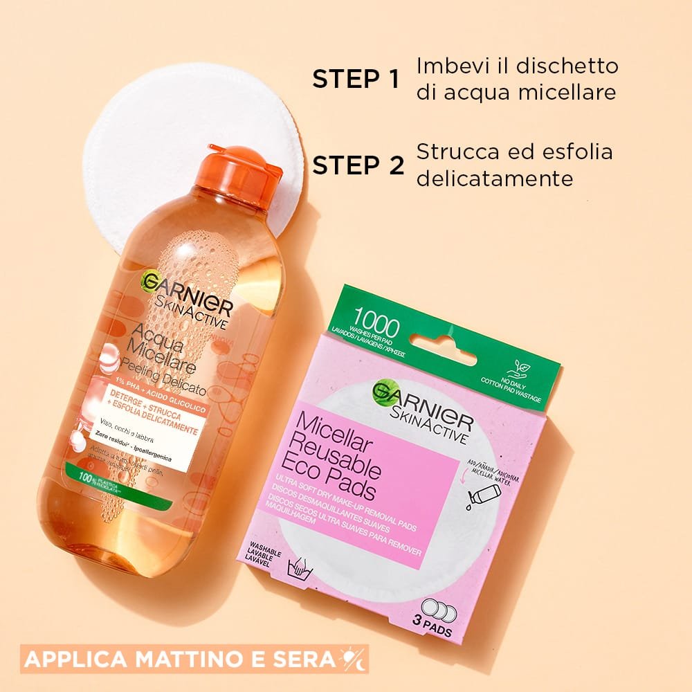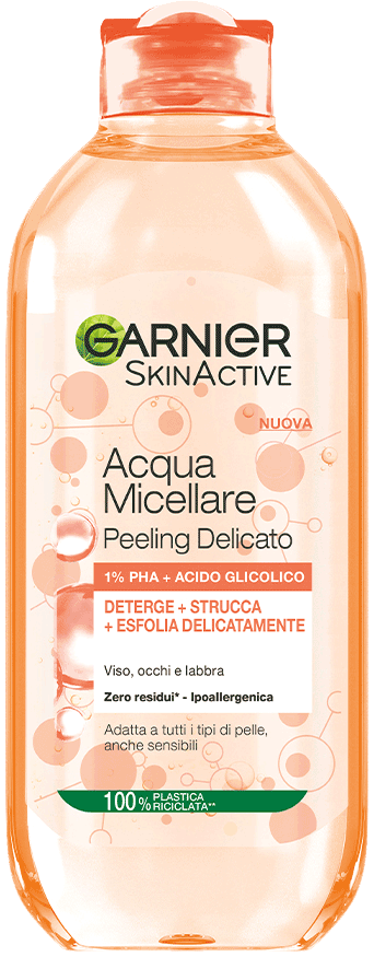 La nuova Acqua Micellare Peeling Delicato Tutto-in-1, con l'1% di PHA e Acido Glicolico, è la combinazione perfetta tra un detergente quotidiano, uno struccante e un peeling delicato. In un solo gesto, tutta l'efficacia detergente dell'Acqua Micellare combinata con una delicata azione esfoliante.