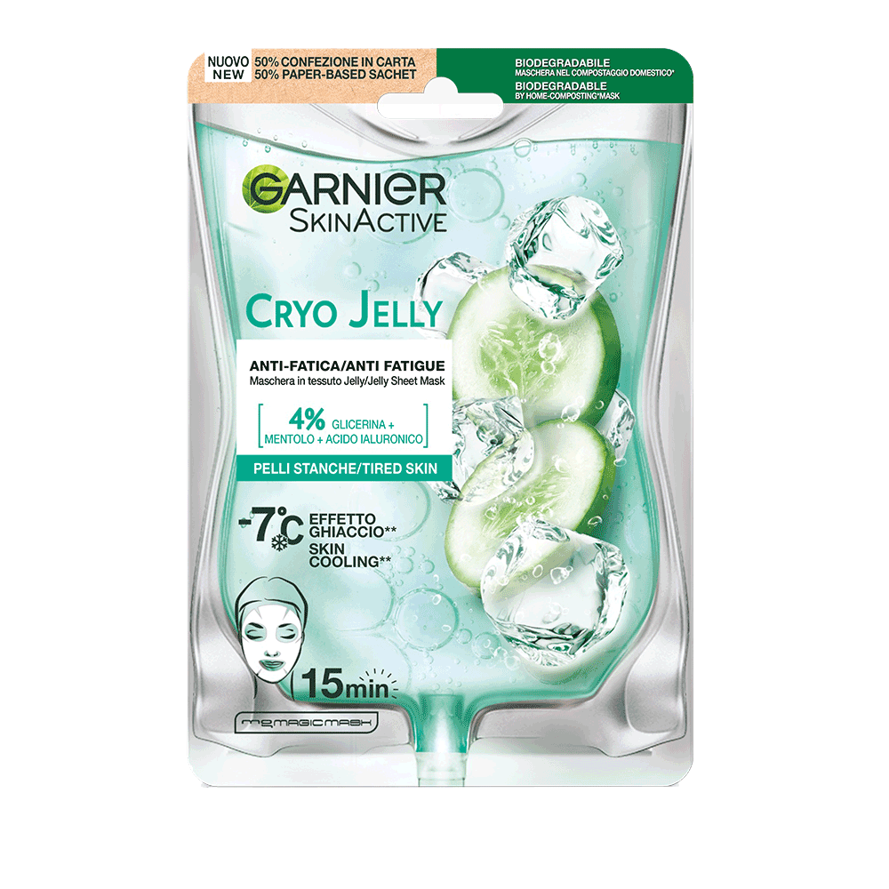 Scopri il potere delle Cryo Jelly, la maschera rinfrescante Jelly che abbassa la temperatura della pelle fino a - 7 C * per minimizzare instantaneamente i segni di stanchezza e rassodare visibilmente la pelle del +18%**. È composta da un TESSUTO JELLY che lascia la pelle intensamente idratata fino a 24 ore e da un siero jelly arricchito con glicerina + mentolo + acido ialutronico, che rafforza la barriere cutanea e trattiene l'idratazione e nella pelle. EFFICACIA CONSTATATA: La pelle sente immediatamente un senso di freschezza e il viso appare visibilmente riposato. Giorno dopo giorno i segni della stanchezza sono ridotti e la pelle appare visibimente rassodata e distesa.
