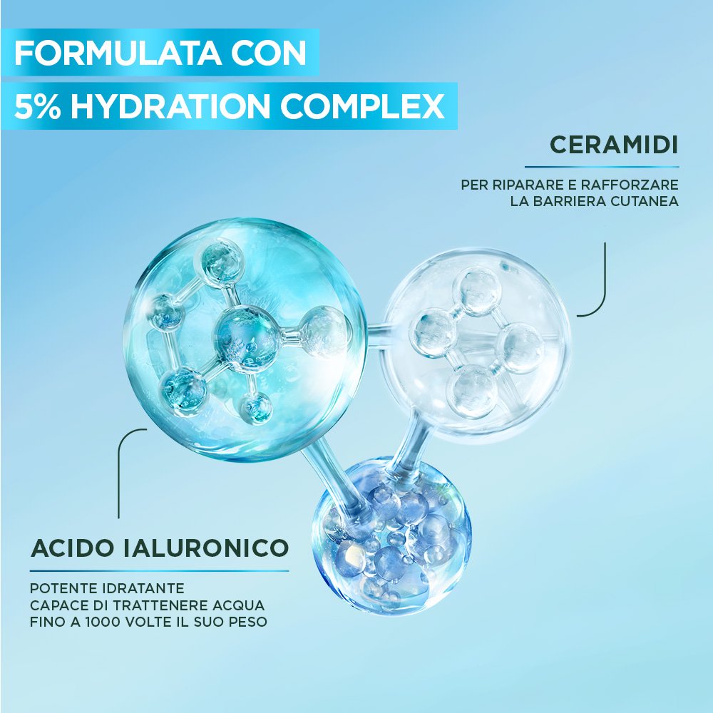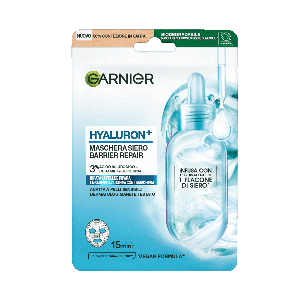 Maschera Siero in Tessuto Hyaluron+ arricchita con Acido Ialuronico, Ceramidi e Glicerina: idrata e ripara la barriera cutanea in 1 maschera.