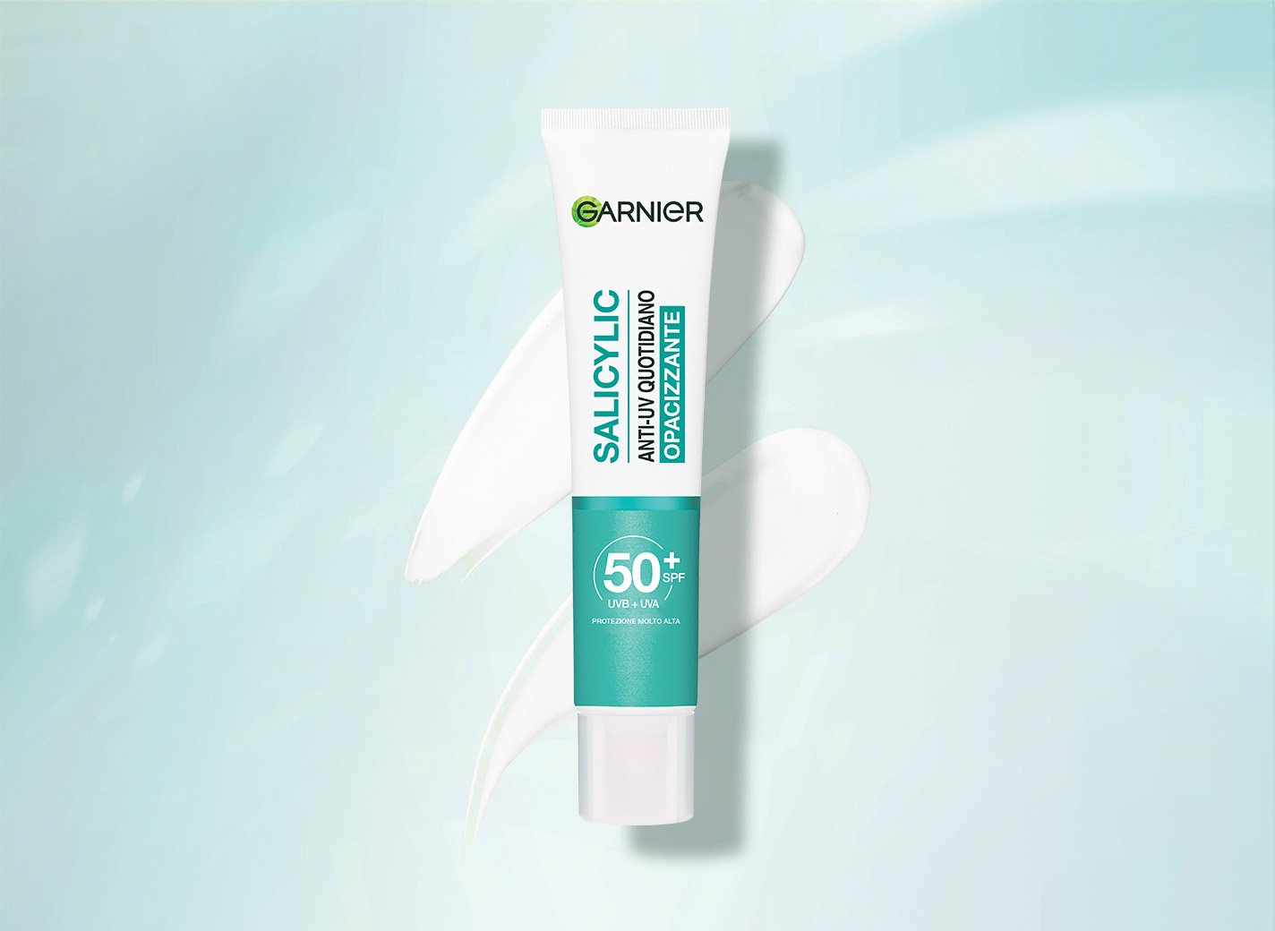 Proteggere la pelle dal sole e opacizzarla allo stesso tempo è possibile con il Fluido Anti UV Quotidiano Anti Imperfezioni SPF 50+ di Garnier. La sua formula con Niacinamide e Acido Salicilico aiuta a opacizzare, mentre la texture ultra-leggera non unge e non appiccica. Ideale per l’uso quotidiano, offre una protezione molto alta dai raggi UV, perfetta anche per le pelli miste o a tendenza acneica.