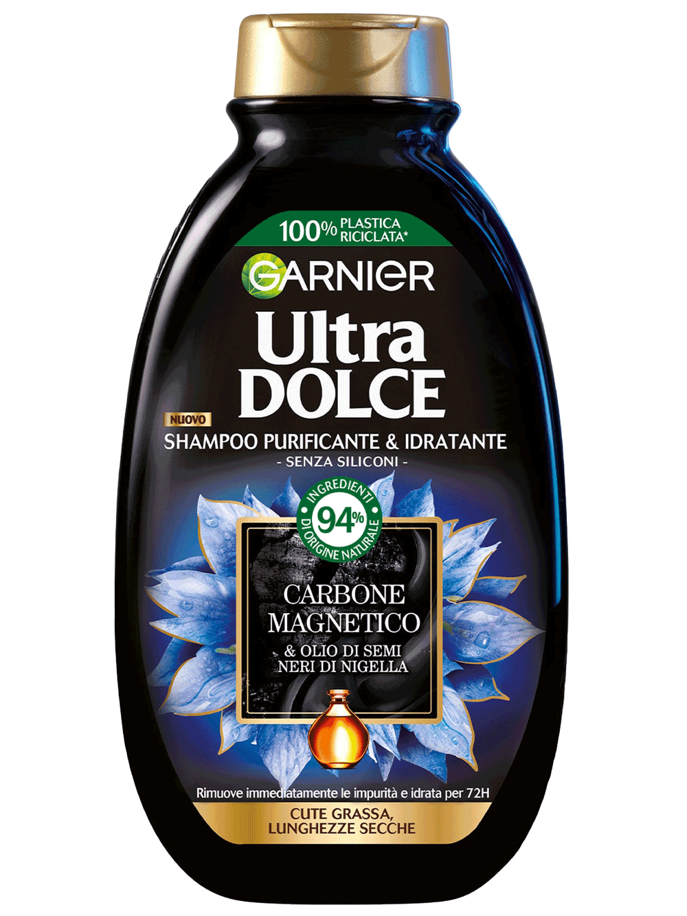 Scopri il nuovo Shampoo Garnier Ultra Dolce con Carbone Purificante ed Olio di semi neri di Nigella Idratante. Il nostro shampoo senza siliconi è il primo di Ultra Dolce con formula al 94% di origine naturale per rimuovere il sebo in eccesso dal cuoio capelluto e offrire idratazione alle lunghezze fino a 72 ore*. Sviluppato per purificare ed idratare i capelli, si risciacqua con facilità senza lasciare residui. Efficace senza compromessi, il nuovo shampoo Ultra Dolce Carbone Magnetico purifica la cute ed idrata le lunghezze. Senza siliconi, coloranti artificiali ed ingredienti o derivati di origine animale.