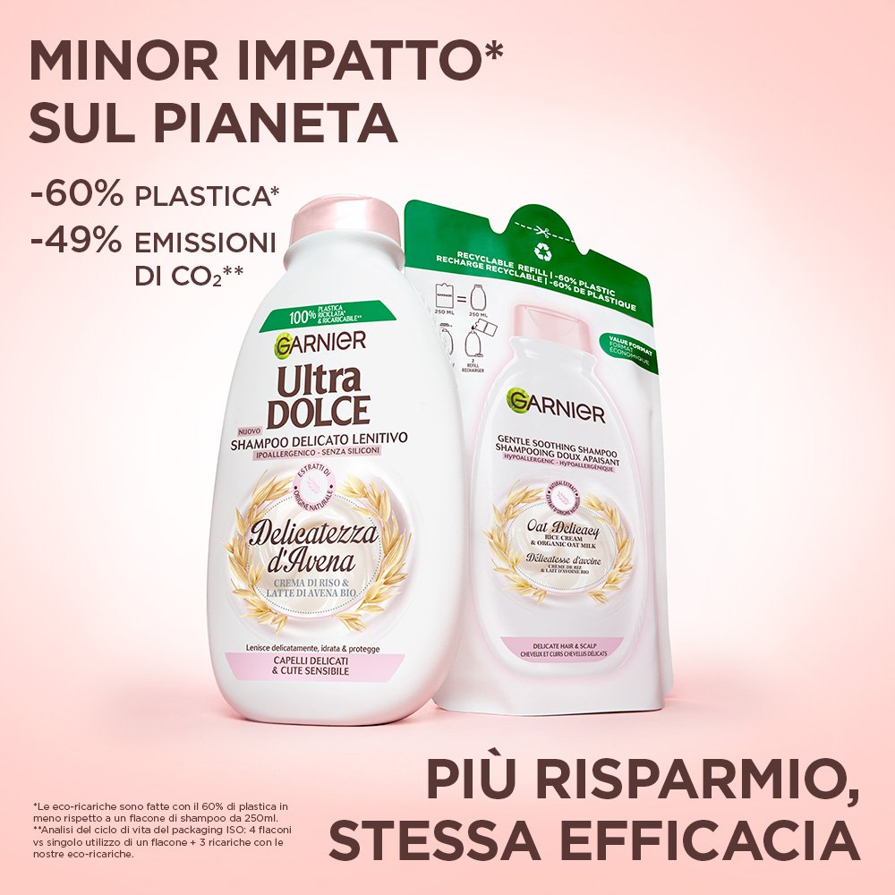 Scopri la nuova Eco-ricarica per capelli delicati e cute sensibile. Il potere idratante e protettivo della crema di riso e del latte di avena Bio, uniti nel nostro rimedio ipoallergenico per una cute lenita e capelli dall'aspetto più sano. Questa confezione riciclabile contiene il 60% in meno di plastica rispetto al flacone di Shampoo 250ml.
