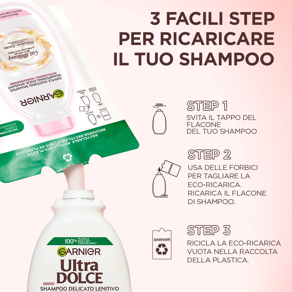 *Le eco-ricariche sono fatte con il 60% di plastica in meno rispetto a un flacone di shampoo da 250ml.