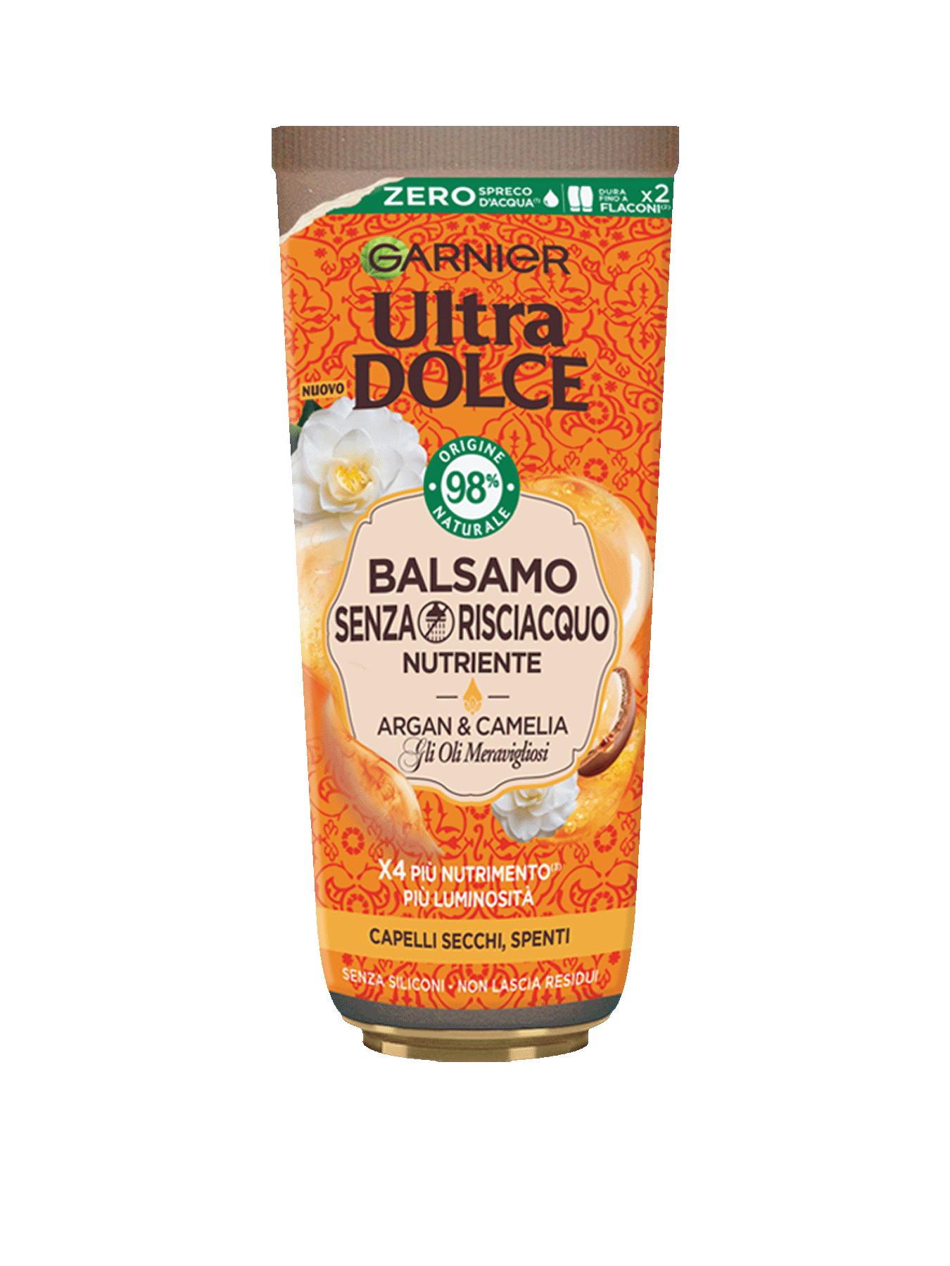 Balsamo senza risciacquo dall'effetto condizionante quattro volte più nutriente* di un balsamo tradizionale, per capelli secchi e spenti bisognosi di un booster di luminosità - Chioma dalla ritrovata morbidezza e lucentezza, capelli nutriti e facili da districare dalle radici alle punte. Olio di Argan e Camelia in una formula dal 98% di ingredienti di origine naturale, Zero spreco d'acqua per il pianeta**(*Test strumentale **Meno spreco di acqua legata al risciacquo)