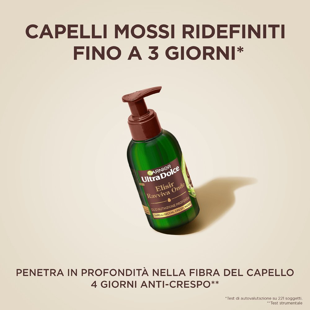 Scopri il potere Ultra nutriente del nostro olio dalla texture più leggera di Ultra Dolce Puro Olio di Avocado & Burro di Karité. Una goccia del nostro Elisir Ravviva Onde è così concentrata che rilascia milioni di micro molecole (omega 6,9) e penetra in profondità nella fibra del capello per un nutrimento intenso e duraturo. Ravviva i tuoi capelli dall’interno per 3 GIORNI DI CAPELLI MOSSI RIDEFINITI E MORBIDI COME LA SETA* e 4 GIORNI ANTI-CRESPO**.