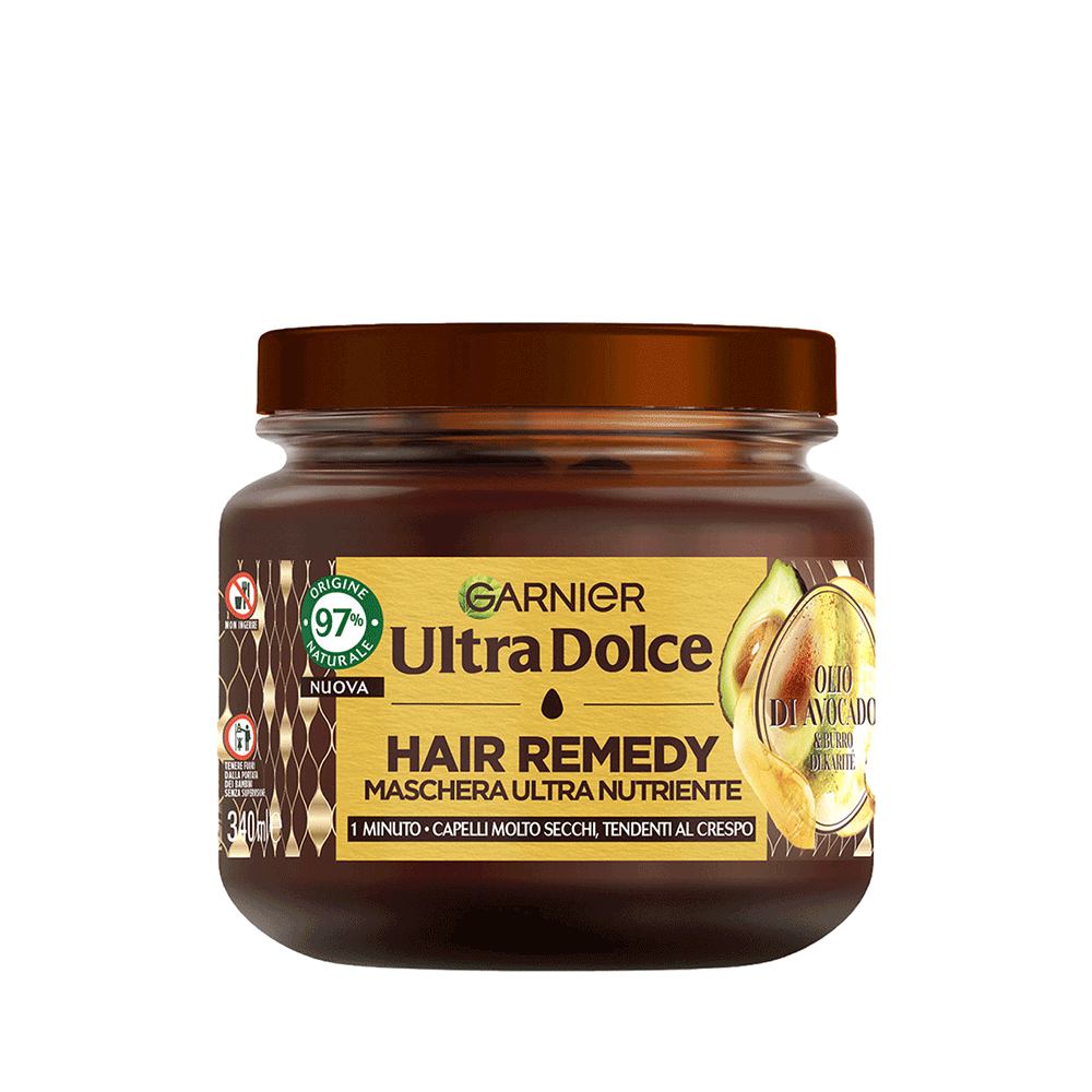 Scopri la nuova Maschera 1 minuto* di Ultra Dolce Puro Olio di Avocado e Burro di Karité per capelli secchi, crespi, mossi. Scopri l'intenso potere nutriente dell'Olio di Avocado & del Burro di Karité uniti nel nostro ricco rimedio. Grazie alla nuova formula già dal primo minuto di applicazione i tuoi capelli appaiono 7 volte più nutriti** e senza effetto crespo fino a 4 giorni**.