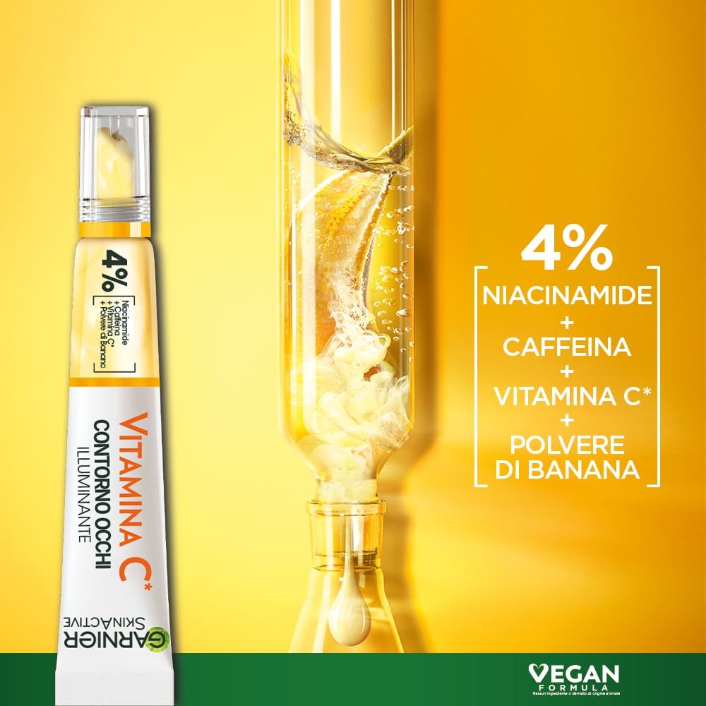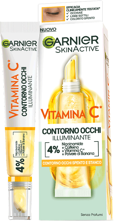 E' clinicamente testato che riduce**: occhiaie, linee sottili del contorno occhi, colorito spento, rughe a zampa di gallina, mancanza di tonicità, pelle ruvida, mancanza di morbidezza e generale aspetto della pelle. In 1 settimana, lo sguardo appare più luminoso e riposato. Il Contorno Occhi illuminante Vitamina C* è adatto alle pelli sensibili e la sua formula è priva di profumo. *Derivato della Vitamina C. **Test cosmetoclinico, 75 soggetti, dopo 4 settimane, risultato medio. I risultati possono variare da un soggetto all'altro.